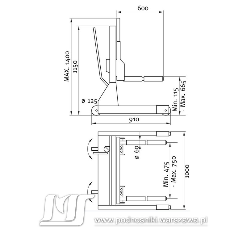 - Przestawne ramiona przystosowują podnośnik do kóła o średnicy 545 - 1278 mm.